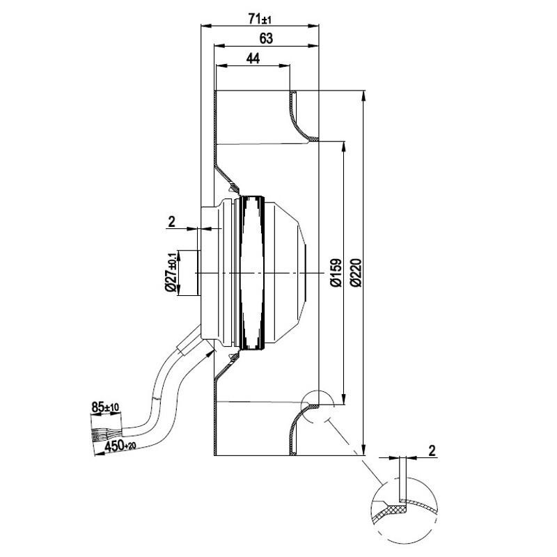 Centrifugalni ventilator EBM R2E220-AA40-05 za peči na pelete. Kompakten in zanesljiv ventilator, namenjen visokim temperaturam.